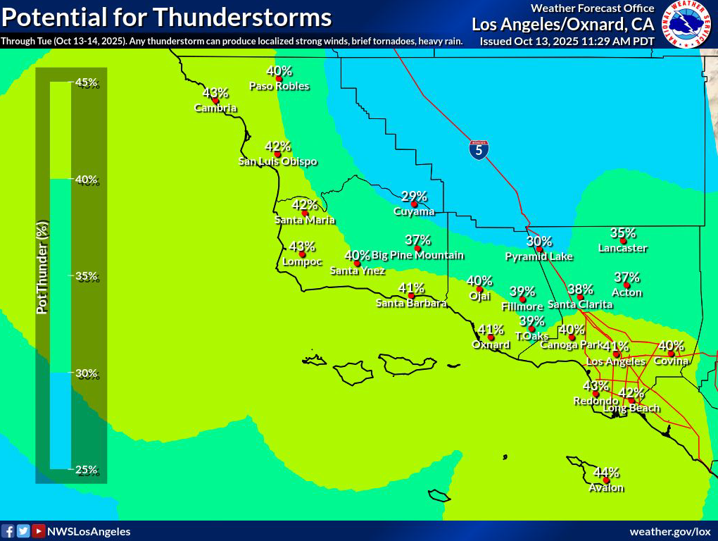 Most of the rainfall is expected to occur between Monday night and Tuesday afternoon. The heaviest rain is expected between 12:00 a.m. and noon on Tuesday, producing rates up to 0.5 inches per hour. However, there is a 30% to 40% chance of thunderstorms expected with this event, which could result in higher sub-hourly rain rates. Thunderstorms could result in higher 15 and 30 minute intensities, with rates exceeding 1.0 inch per hour. These higher intensities could exceed the established post-fire debris flow thresholds for the Mountain Fire burn scar, with the highest chances occurring in the South Mountain area.